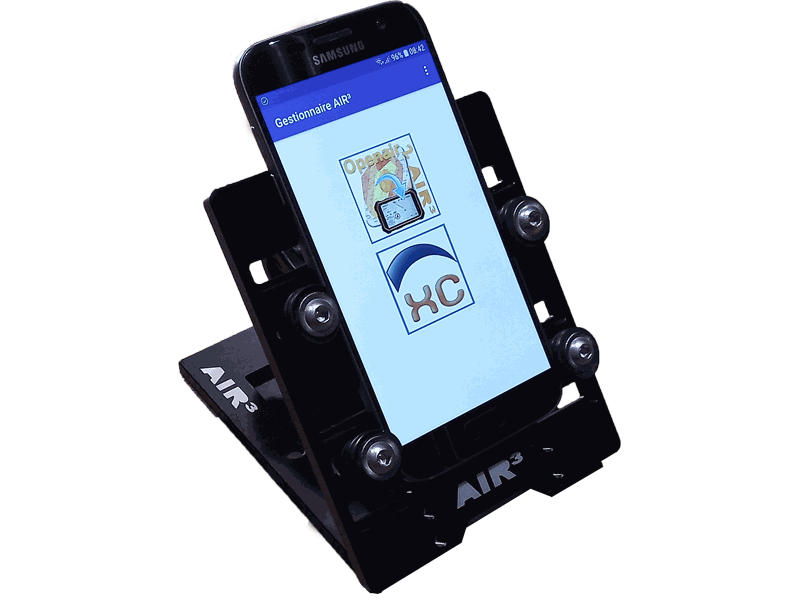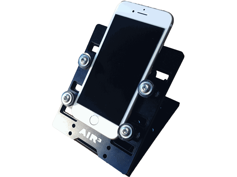 Robust support for any smartphone with articulated double head arm, Aluminum alloy. Seat plate, articulated arm, fixing plate.